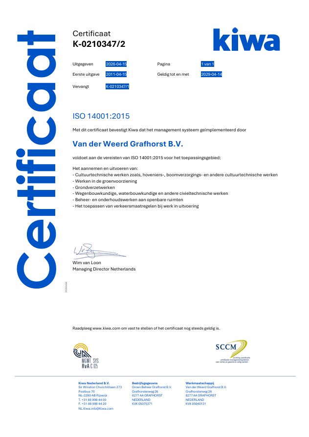 Als Van der Weerd Grafhorst B.V. zijn we trotse bezitters van het ISO 14001 certificaat. Dit internationale certificaat is een erkenning van onze toewijding aan milieubeheer en duurzaamheid binnen onze bedrijfsvoering.